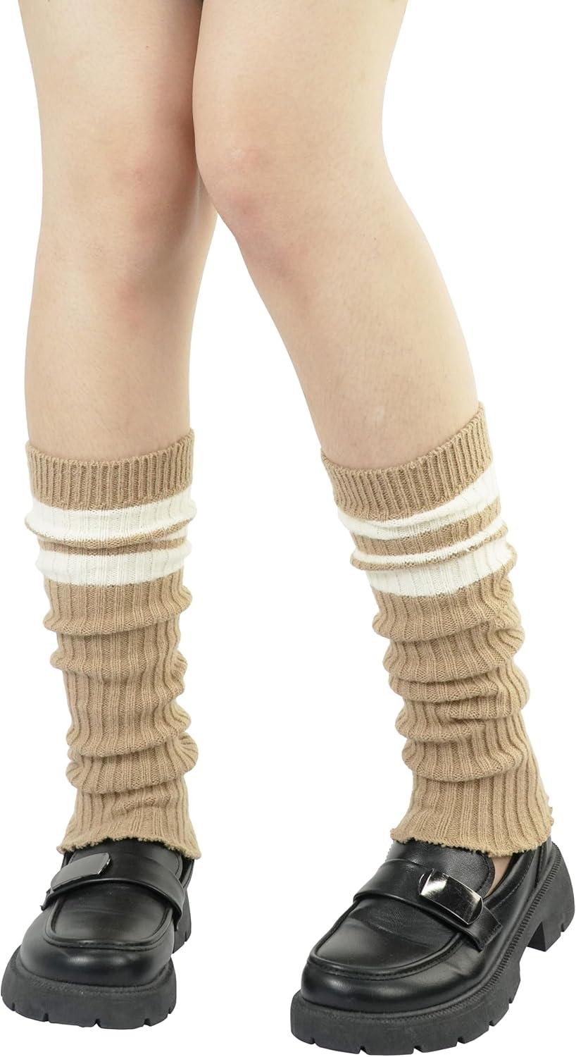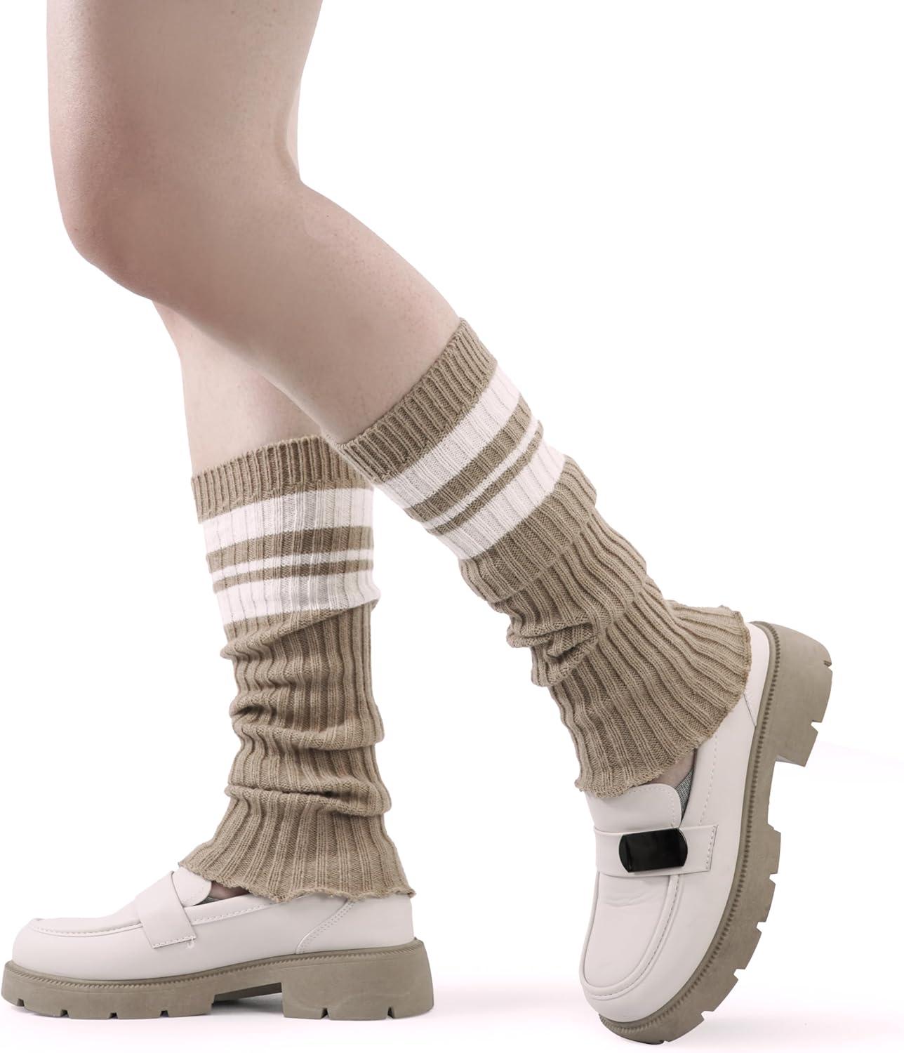 BomKinta Leg Warmers for Women – Soft Fashion Knit Calf Accessories – Cute 80s Ruffle Leg Sleeves for Party Yoga(2 Pairs – Beige Stripe Khaki)